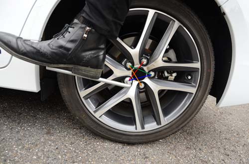 | 先將輪圈螺絲依對角位置卸下(太緊可用腳輔助)。 |