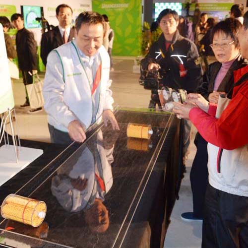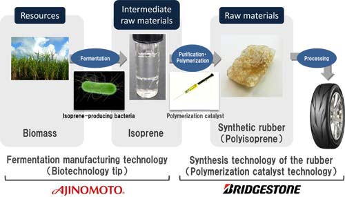 | Bridgestone與日本調味料品牌Ajinomoto(味之素)合作,以粹取科技提煉生物性蛋白質中的異戊二烯,並藉觸媒技術製造生質丁二烯聚質橡膠。 |