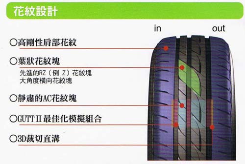 | 在輪胎肩部使用高剛性花紋,而中間則採用葉狀花紋胎塊設計,除了可以因應過彎時的變形,在靜肅性方面也能獲得提昇。 |