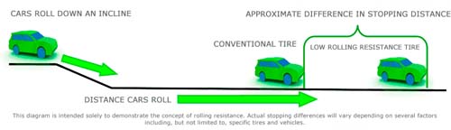 | 低滾動阻力輪胎與一般輪胎之滾動距離比較,可簡單看出其節能之原理。 |