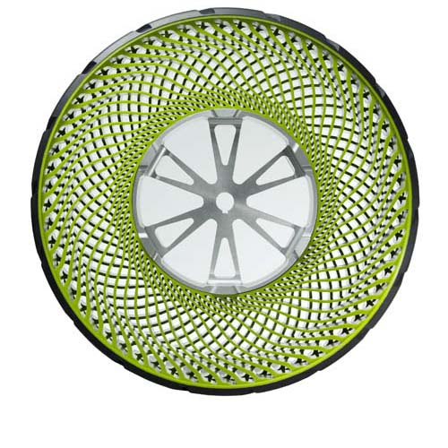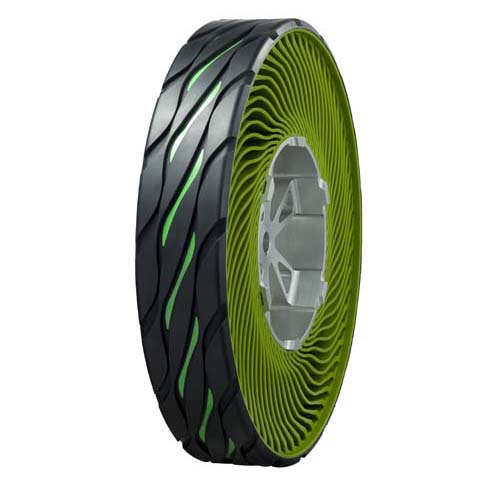| Bridgestone的免充氣輪胎採用可回收再利用的熱可塑性樹脂,並藉由雙面輻射條來形成輕巧的緩衝支撐結構,其應用對象鎖定日常使用的輕型車輛。 |