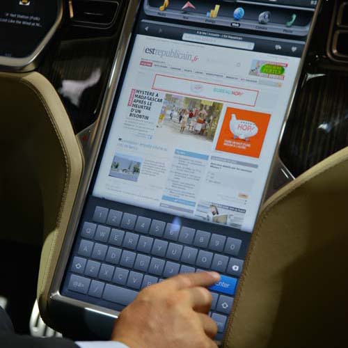 | 新車款內的電子訊息系統愈來愈複雜,例如Tesla Model S中控檯就有一個巨大的觸控螢幕,4G通信時代的到來更意味著行車間高速連網不是問題。 |