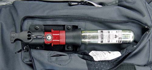 | 充氣裝置透過安全機制(圖中金屬圓球處)控制充氣,安全扣則與聯結車身之高張力彈鎖相連,至少需30kg的拉力才會引發充氣機制。 |