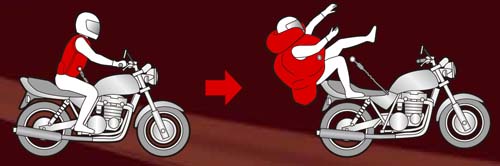 | Hit Air作動示意圖,當人車分離時即自動充氣,0.205秒即可將氣室充飽,大幅降低撞擊力道對騎士本身之傷害。 |