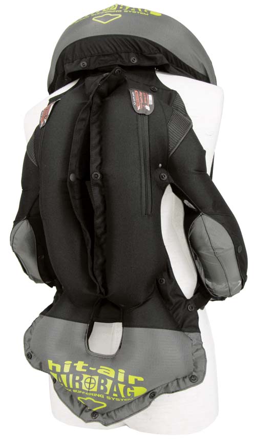 Hit Air氣囊防摔衣簡單來說,就是把安全氣囊的概念運用在防摔衣上,在防摔衣上內建充氣氣室,氣室將環繞騎士的胸、頸與脊椎形成一道保護層,利用高壓CO2瓶瞬間充氣效果讓氣室膨脹,進而達到保護騎士的效果。如此一來,重機事故易造成騎士胸腔內出血、脊椎與頸椎傷害所造成的重大傷害,將透過氣囊防護,大幅降低衝擊力道,將傷害降至最低。