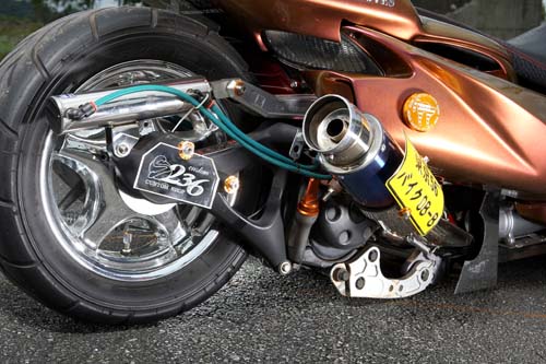 | 藉由修改後搖臂的寬度,硬是塞上了車用輪胎,霸氣十足。側置日規大牌展現出濃厚日式風格 |
