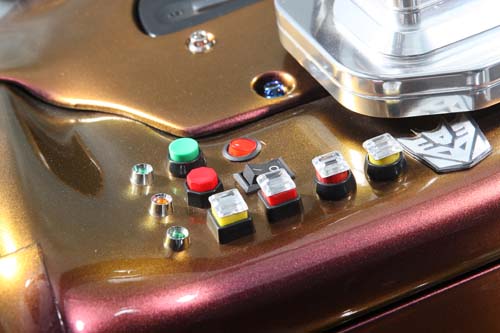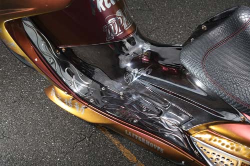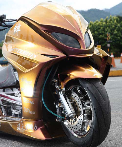 當車身拉長後,為了不讓身形太過單薄,車頭與車側都裝上了寬體空力套件,充滿肌肉感的大型進氣口與宛如異形般的長車頭,再加上延伸尾部線條的大型尾翼,以及寬大的車用後胎,只能用氣勢磅礡來形容。紫金色的特殊烤漆,能隨著不同的角度呈現光影變幻,踏板、懸吊、輪框、卡鉗、把手、後照鏡等全都使用電鍍材質,握把上還鑲上了水鑽,更帶來奢華的視覺享受。經過特殊皮革編織的消薄座墊與特殊造型的把手,更讓騎士有著坐在沙發上般後躺慵懶又舒適的騎姿。極其誇張的形體絕非一般改裝車可以比擬。