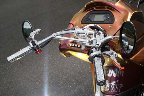 | 向後延伸的電鍍把手,讓騎姿有如坐在沙發上般舒適,握把上還鑲了滿滿的水鑽,奢華度破表 |
