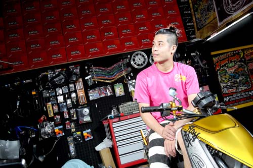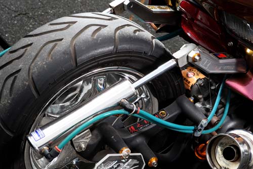 以機車界來說,車輛後移最初是為了直線加速賽而做的改裝,由於動力太過強大,只有加長車身軸距避免前輪浮舉影響成績,同時為了提供更好的抓地力,也會一併更換更大接地面積的後輪。然而有了動力就會想改視覺,在長軸距、低趴、大輪的結構下也出現許多視覺改裝風格孕育而生,而台灣在這方面大都取自於日系的VIP改裝風格,由於多數的視覺車輛都會以後移作為改裝的重點之一,也誕生出「後?移動」這個名詞。老闆解釋,為了兼顧日常行駛機能,如果想要做到極致的低趴效果,大多會採用氣壓懸吊系統,最大的特色在於可變行程的特徵,讓這輛車能達到極具張力的視覺效果。老闆也不諱言的說,用在兩輪上的氣壓懸吊系統相對簡單很多,從結構上來看可分為四大部分,分別是儲存氣體的鋼瓶、避震器桶身、將氣瓶內空氣打入伸縮桶身的馬達、控制氣體流動的電磁閥門等等。由於只是為了視覺上的外觀,避震對於路面回饋的調教通常不在意,只要能確保行程的作動正常、缸壓是否足夠、氣瓶有無漏氣就好,真正的困難點還是在於安裝的車體結構方面。