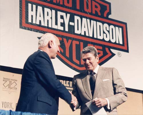 | 1987年5月,哈雷前總裁Vaughn Beals與美國前總統雷根會面,慶祝哈雷成功向美國政府提出對外國機車抬昇進口關稅。 |