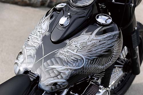 | 彩繪的兩條龍讓油箱更顯威重,在強烈的動感之外,也不失日本畫該有的優雅質感。 |