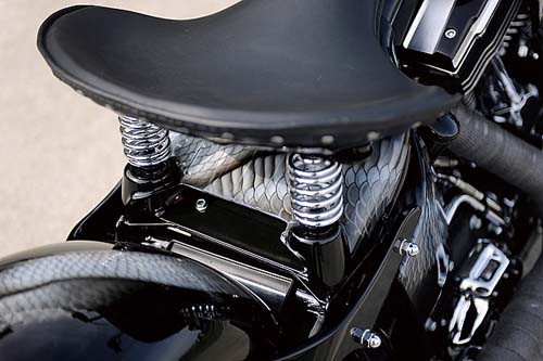位於歧阜縣羽鳥市、持續追求更高境界品質與服務的鐵馬舍,除了以和風創造一致性、自在舒適的展示間之外,附近還擁有經過認證、技師全部都具國家資格的小工廠「鐵馬所」。由與鐵馬舍系出同門的鐵馬所進行的這部整車改裝,展現了「鐵馬舍流」的風格。最惹人注目的,就是大膽繪於全車身上的龍圖樣。從油箱開始仔細繪製至前叉甚至座墊下方的這條龍,也是鐵馬舍的象徵。接著看向腳邊,超寬幅條的RSD前、後輪框及Python的Throwback,創造出極為硬派的外型。而彷彿與之對比的、以哈雷原廠其他車款部品再加工過的座墊、土除等,則是帶出較為簡潔的形象,聳立的Ape把手,更有畫龍點睛之效。