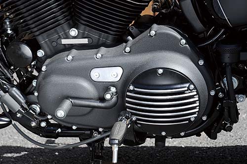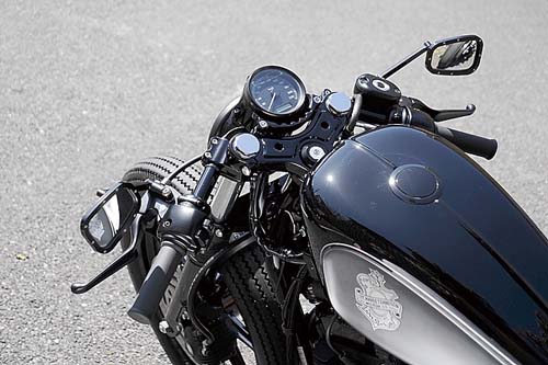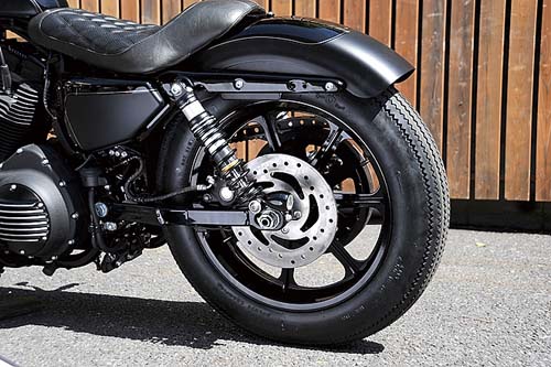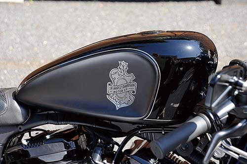 Sportster車款會因為改裝而有千變萬化的形象。雖然舊車款即有這樣的特質,但Harley中野的松本店長,或許可說是到目前都還持續實現如此改裝的重要人物。美式運動形象,若運用在汽車上就是類似Shelby Cobra或是Dodge Ranger等,這些具有獨特運動性的車款是美國獨有的。這部Iron的改裝感覺上就是用那樣的形象為基礎所完成的。油箱的左右採取內凹設計,騎乘時就有如懷抱著油箱的感覺。緊握著分離式把手在都市中馳騁的姿態,完全就是美式運動風格的展現。經典的美式運動風和近年所謂的「肌肉車」又有所不同,如果想要在現代的Sportster上實現這樣的風格,或許除了以Iron車款做為改裝基礎之外也別無他法。將車身上唯一閃耀著光芒的鍍鉻排氣管改以消光黑塗裝,由此可以看出Harley-Davidson中野充滿都會玩心的改裝概念。