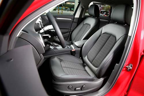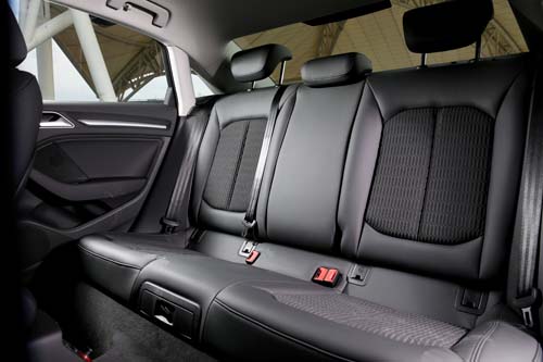 A3 Sedan的前座空間十分充裕,大多數體型的駕駛人應該都能輕易調整出舒適的乘坐姿勢,前座椅的造型設計在運動風情中帶著些許時尚感,特殊的面料也帶來了不同於傳統座椅的視覺感受。由於Sedan版與Sportback版本的車身造型差異,後座的乘坐空間表現也因此不同,A3 Sedan的車頂比掀背版車型來得更為斜切,因而影響到後座的乘客的頭部空間,雖然影響的幅度不大,但仍帶來了稍微的壓迫感;與一些刻意強調跑車造型的車款相比,後座的頭部空間仍在實用範圍之內。