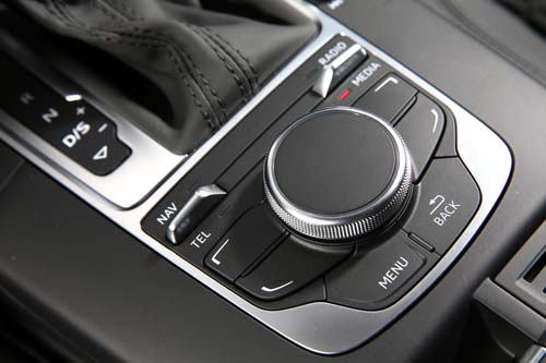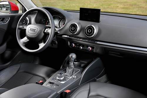 A3 Sedan的座艙造型設計沿用自Sportback版本,圓型的空調出風口是造型上的一大特色,儀錶板與方向盤的造型設計採用了Audi慣用的設計,有著相當科技的風味。不過科技感最濃烈的部分,則是中控檯頂端的MMI多功能液晶螢幕,它不只具備電動升降的功能,超薄型的設計更是非常引人注目。刻意壓扁的中控檯按鍵造型看來就像是與金屬飾條融合為一的設計,而最重要的多媒體控制介面則全部集中在排檔座的後方,包括MMI多媒體介面的大型控制旋鈕以及相對應的控制開關;A3 Sedan的車內控制介面與掀背版本大致相同,然而在空間的部分則有著較為明顯的差異。