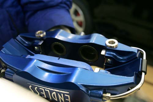 此外Endless最自豪的便是有著超高剛性與極致輕量化的卡鉗,取自於Super GT與超級耐久賽的實戰經驗所需特性加以開發而成,因此產品具有足以應付激烈煞車所需的高剛性,以「匠」(TAKUMI)系列活塞卡鉗組為例,利用全新製程技術將鍛造成型的卡鉗左右兩側採用公母卡榫滑槽組合方式,以增加卡鉗抵抗活塞推擠時的反作用力,進而減少高速煞停時的多餘應力,以獲得更理想的制動效果。而超輕量更是另一項特色,竭盡所能將不必要的額外重量加以去除,在本體上所見的鑽孔手法則達到最佳輕量化的功效(較同屬性產品減重約30%),使用五千噸鍛壓及耐酸處理的一體成型特殊合金鍛造品,甚至因高壓鍛造的材質密度太高,連著色都有困難,如此才可以將變形量降至最低,避免來令片因為卡鉗下方剛性不足造成來令片的偏磨現象。