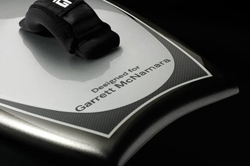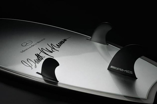 這塊名為海中銀箭(Silver Arrow of the Seas)的衝浪板是賓士原廠與葡萄牙BBDO Portugal設計公司一同合作開發,並在去年冬季進行了一連串的風洞測試。這塊浪板最大的特色,除了底部的鰭印有原廠性能表徵的AMG字樣外,就是它只專屬於Garrett McNamara一人所有。