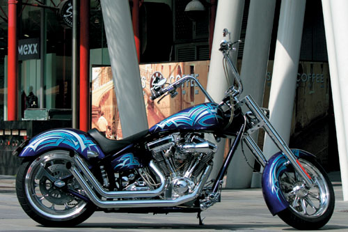 這款Chopper名為Double Down,由American Performace Cycle打造,與我們六月號報導的粉紅巴比Hustlers算是姐妹車,車架與引擎皆相同。不過這輛Double Down所展現的風格完全不同於Husslers。Double Down的字面意思頗有悔恨的含意,若把車色-藍色的憂鬱加入其中,似乎更能突顯這樣的氣氛。不過看到實體完全不是這麼一回事,所有耀眼的改裝配件都是價格昂貴的御用部品,任誰也不會把重點放在車名上,想像騎在路上的騷包指數,絕對不亞於一輛Lamborghini。