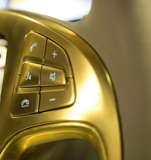 來自德國的知名改裝品牌 Carlsson,鎖定金字塔頂端的客群,將M.Benz SClass融合法國國王路易十四凡爾賽宮宏大、奢華的建造理念,推出了名為Carlsson CS50 Versailles的頂級移動行宮,展現出金碧輝煌、華麗雍容的皇家氣派。與凡爾賽宮的設計理念相同,極致奢華是唯一的設計原則,全車經過200位工匠的金雕細琢、使用超過 1000 張以上的金箔裝飾,不論是外觀的水箱護罩、車側、前後保桿,還是內裝的各項開關按鍵、出風口、飾板等 278 項零件也全部採用鍍金處理,並使用最頂級的深褐色 Nappa真皮材質,並可依照車主的要求完全客製化,富麗堂皇的程度,絕對讓人瞠目結舌。動力方面同樣經過升級,將最大馬力提升700hp,使得這輛奢華的路上行宮也能移動的飛快。Carlsson共推出CS40 以及CS50兩個不同等級的產品,售價依選配不同而異,介於 268000 到 395000 歐元之間,並只限量生產 25 輛,還真是有錢還也不一定買得到。