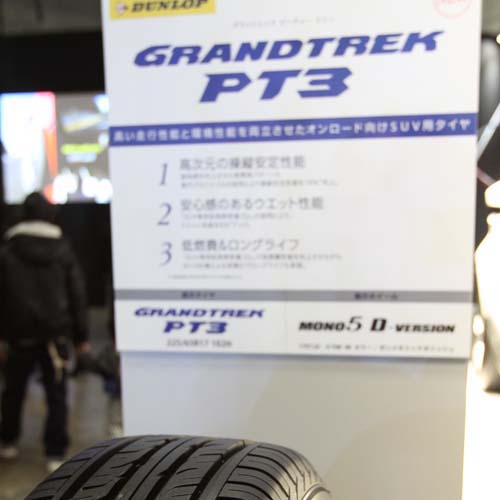 今年Dunlop的主題非常清楚,就是「Direzza ZII」與「Grandtrek PT3」兩款新胎的發表。主打加強縱、橫向抓地力與長時間激烈操駕安定性能的Direzza ZII,分別裝在高性能的Mazda RX-7 FD與Mitsubishi Evo X車上,以達成競技用車對於輪胎的嚴苛要求。