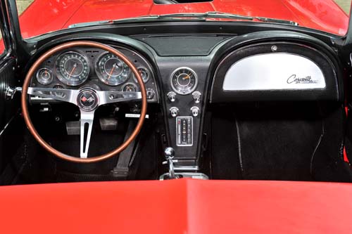 這部’64年出廠的Corvette Stingray C2車型,動力系統規格為5.4升 V8 OHC頂置式單凸輪軸汽油引擎,最大出力300hp/49.7kgm,隨著1963年第二代Corvette的C2大獲成功,當時GM高層決定針對外觀進行小小的調整,像Coupe車型的後擋風玻璃部分從此以後由分離式改為一體式,C柱後導風口面積也變得較大,車尾油箱蓋及上方的雙旗幟廠徽也跟著變化。新年式的C2也針對凸輪軸進行改良,讓最大馬力來到365hp,另外的燃油噴射版本,更讓動力提昇到375hp;價錢方面,當時敞篷款4,035美元的售價換算成目前市價大約22,000美元,在那個陽春麵每碗不到兩塊錢台幣的時代可不是阿貓阿狗都買得起。