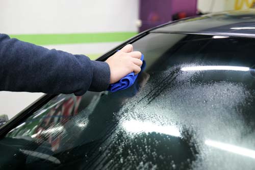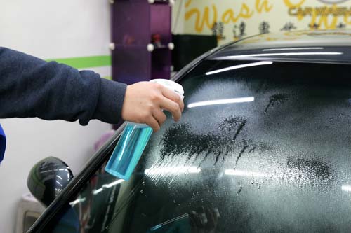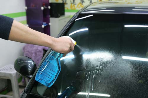 市面上有許多專門的汽車玻璃清潔劑,通常也內含除油膜的成分,大致可分為噴霧型、拋光型、雨刷精等種類,噴霧型的除油膜劑由於使用起來方便,只需5~10分鐘便能完成,建議雨天出門前可先進行除油膜的步驟,確保行車的安全,做法是先用中性的專用清潔劑清洗前擋風玻璃,把一些表面較明顯的髒污先去除掉,接著噴上除油膜劑,切記勿使用清水沖洗,只需找一條乾淨的纖維布擦拭,乾燥後便能發揮效果。而拋光型的除油膜劑算是較為進階的產品,效果較好、持續時間也較久,可以建議在清洗愛車之餘,順便多做一道手續,一樣是先初步清潔完前擋後,將適量的膏狀藥劑倒在海綿上,像打蠟一樣將其均勻塗抹在前擋風玻璃上,過程中切記避免使用一般廚房用菜瓜布清潔前擋玻璃,因為一般菜瓜布含有金鋼砂成分,可能會刮花前擋玻璃。有些店家會使用針對汽車玻璃專門研發的極細鋼絲絨布,搭配除油膜劑可有效清潔前擋玻璃的髒汙,完畢後同樣使用乾淨的纖維布擦拭即可。內含除油膜功效的雨刷精算是較為簡便的方式,只要行進間感覺有髒汙卡在前檔風玻璃上,拉拉雨刷拉桿就能達到有效的初步處理,使用方式需經過稀釋,通常瓶子上頭都有貼心的量杯設計,依照瓶身上的指示,照比例加入即可。