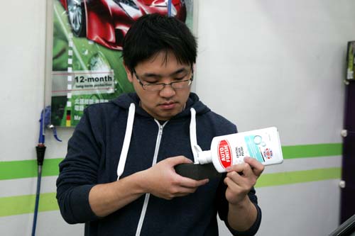 | 在海綿上倒入適當的除油膜劑,接著以順時針的方式均勻推開。 |