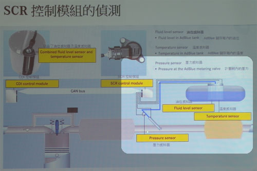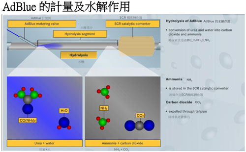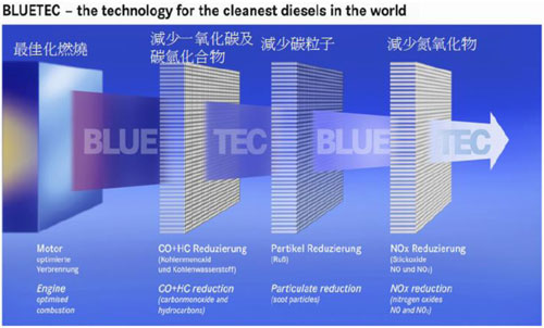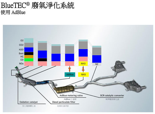 | 為符合EC6期,BlueTEC取消氮氧化物觸媒轉化器,將通過DPF的氣體採用選擇性觸媒轉換器SCR、尿素溶劑AdBlue,並透過感知器全程監控排廢氣中的氮氧化物,自動控制排放系統運作,將廢棄還原為對人體無害的水與氣體。 |