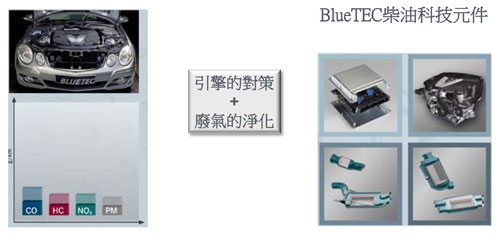 | BlueTEC的概念是引擎最佳化後先處理與汽油車相同的CO及HC,隨後再處理柴油車特有的微粒子與氮氧化物。 |