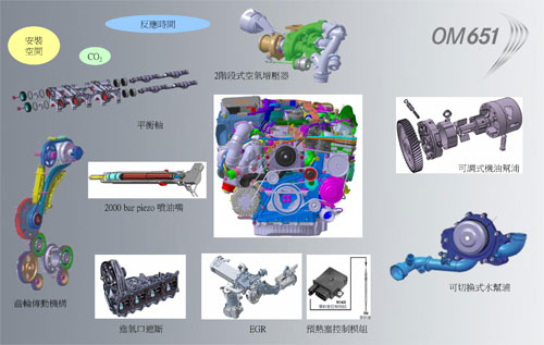 | 柴油引擎最佳化。值得一提的是採用大渦輪及小渦輪的兩階段式空氣增壓器(非雙增壓),小渦輪啟動時帶動大渦輪,當需要大渦輪作動時,動力得以無縫銜接,化解渦輪遲滯問題。 |