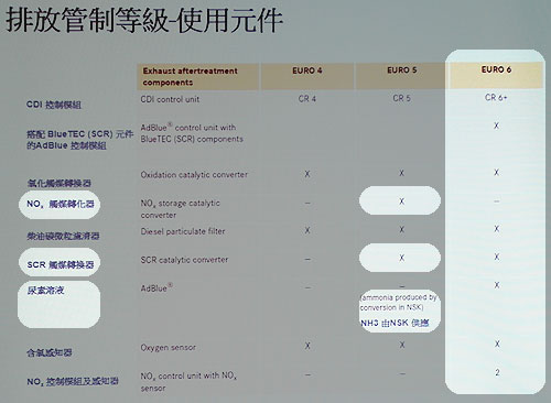 | 法規要求所有污染物下降的速度愈來愈快,到的EC6,氮氧化物甚至要求降到目前EC5的一半。 |