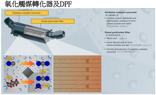 | 廢氣排出引擎室之後第一道關卡,氧化過程降低一氧化碳及碳氫化物。其餘無法氧化的微粒子被DPF柴油碳微粒濾清器吸附。 |