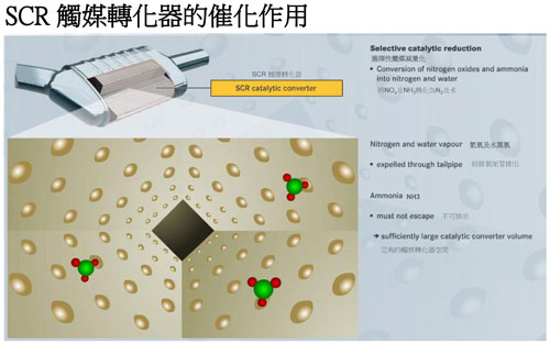 | 圖中桃紅色的NOX氮氧化物最後被處理成水及無害的氮氣。 |