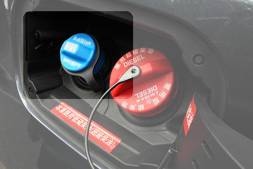| AdBlue自加油箱蓋側的專用孔添加。消費者可以自行添加,但賓士保養廠會提供抽光舊AdBlue再添加新溶劑以達到最佳效果。 |