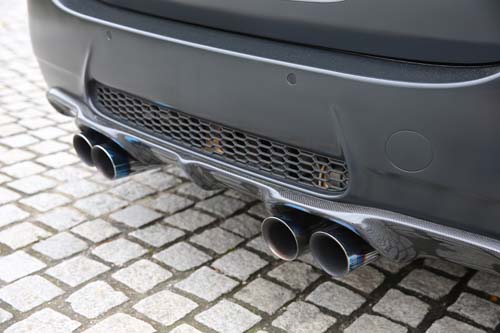 | 排氣尾段改裝知名iPE製品,四出造型正好對應M3後下擾流板,鈦合金所發出的排氣聲浪相當獨特,高轉速時還會發出有如超跑般的尖銳「叫聲」。 |