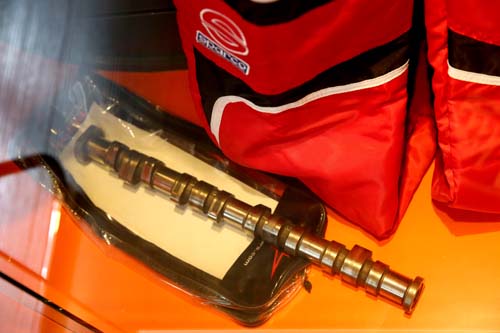 | Mini Cafe還提供改裝套件販售的服務?當然不是!店內部分陳列品是從老師的Mini R53上拆下來的,像這支原廠凸輪軸就是因為改裝高角度製品所拆下。 |