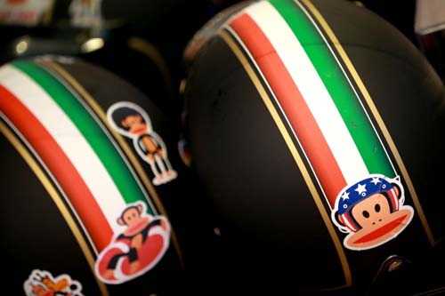 | 這兩頂安全帽當然是老師跟老闆娘的,不過並不是騎Triumph戴的,而是老師還有一輛宏佳騰My125,難怪這兩頂安全帽這麼可愛。 |