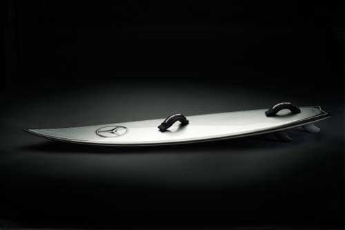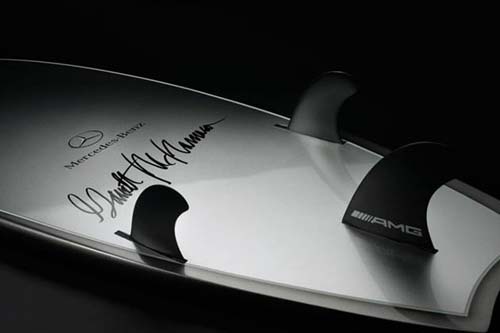 M.Benz原廠特別為世界衝浪好手Garrett McNamara訂製專屬的衝浪板。44歲來自夏威夷的Garrett McNamara,近日在葡萄牙納扎雷海灘成功征服一道27公尺、相當9層樓高的大浪,成為最新的世界紀錄。這塊名為「海中銀箭」(Silver Arrow of the Seas)的衝浪板是M.Benz原廠與葡萄牙BBDO Portugal設計公司一同合作開發,其底部的鰭印有AMG字樣,且只專屬於Garrett McNamara一人所有。