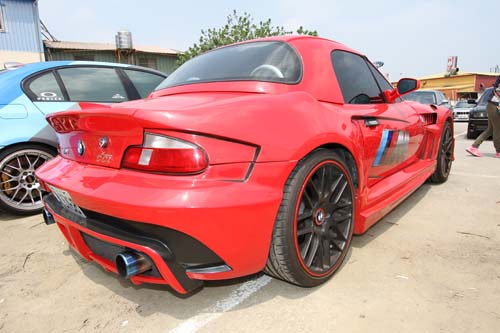 | 從外觀來看,這部Z3應該是外觀改最殺的其中一部,前後保桿、葉子板與左右側裙等,都已經裝上誇張的空力套件,略為寬體的設計,低扁車身加上稜角分明的線條,就像顆準備畫破空氣的子彈一樣。 |