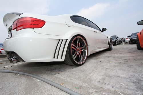 | E92 M3在外型上與一般3系列比較起來,最大差別就在於較為寬體的前後葉子板,不過這部E92車款的爆龜程度又比E92 M3來得誇張許多,且空力套件表面的平整度與縫隙密合度等,有著相當不錯的水準,讓這部車有著廠車般的低平感。 |