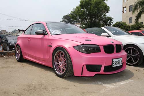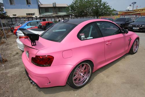 | 誰說性能車只能是陽剛的顏色,像這部BMW 1M就貼滿粉紅色的車身彩貼,搭配同樣色系的HRE鋁圈,讓整部車有著讓人眼睛為之一亮的感受,不過可別因此就覺得它好欺負,沒看到車內白色防滾籠與M-Power調校的性能,馬路或賽道上想追上它,可是得先稱稱斤兩。 |