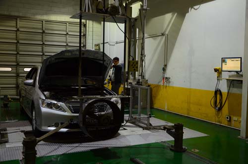 油耗及排汙究竟是怎麼測的?透過在ARTC內的實際示範,為了不讓環境因素影響到油耗檢測的準確性,耗能項目並非實際上路跑東跑西,而是在實驗室內將車輛固定在機台上以軟硬體原地獲得數據;在事前驗明車輛的動力輸出和車重等基本資料後,正式測試前一天會先讓選手車上機台,除了讓測試人員了解該車的基本狀況外,還可讓車內ECU先學習滾輪的阻力,接著便開到靜置室靜放12小時來讓引擎本體及油溫達到常溫,以迎接隔天在室溫攝氏20~30度的室內測試。測試前車輛會先洩光油箱內的油並裝入1/3的ARTC測試用油,此油品成分與一般加油站裡的汽柴油稍有不同,目的是為了讓選手車在測試過程中燃油狀況保持一致性。另外一個值得觀察的,就是迴轉輪能依照車重來調整出適當的摩擦力, 車前大風扇還能在測試過程中產生風阻效果來模擬120km/h以下車速的狀況,最後便根據排氣管所測得的碳含量,在物質不滅定律下還原出精準的耗油量,同時藉由得到的一氧化碳、二氧化碳和碳氫化合物之比例,藉以了解該車輛的汙染程度是否超過標準。
