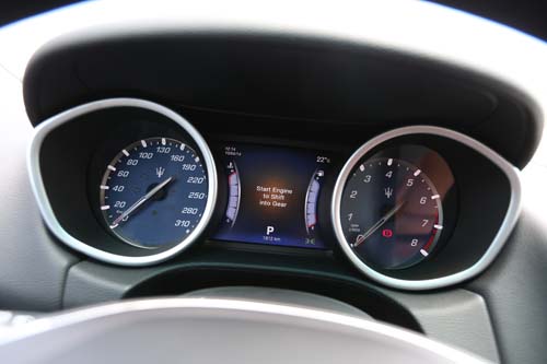 | 儀錶板使用Maserati最具代表性的藍色為底,中央的多功能行顯示幕可提供豐富的行車資訊與多種色彩。 |