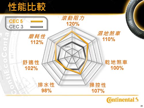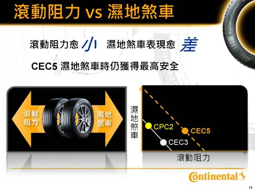 | 德國馬牌輪胎所研發的CEC5,以領先科技突破低滾動阻力與濕地煞車相互對立、無法共存的條件。 |