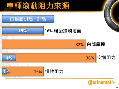 | 車輛滾動阻力的來源,有21%是由輪胎引起,其中更可細分為輪胎接觸地面、內部摩擦、空氣阻力和慣性阻力。 |