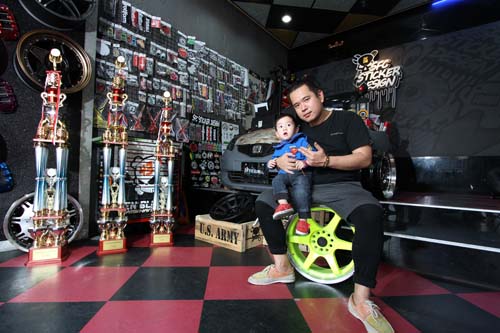 | 除了技術了得外,捷行輪胎廠內還備有大量海拉風式深唇大J數鋁圈,加上改裝經驗豐富,也成為許多中部海拉風玩家調校愛車底盤的重鎮,像圖中這位開著Big Tiida的阿源就是其忠實顧客,且鋁圈樣式還是家裡財務大臣決定的。 |