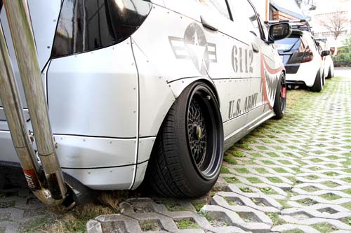 組合好胎圈後,為使車輛呈現趴在地上的視覺效果,外傾Camber角度的負值設定也是不可少的,至於能負到幾度則因車而異,像捷行輪胎梁總經理的BMW E46 M3座車,後輪Camber作到-8度就很誇張,而SFC彩貼職人的Fit車友最多則可做到-15度,不過平常路上開多半只設定到-8度左右而已,過大的外傾角度,胎面的接地面積會變得很小,抓地力會變差,胎壁甚至還會摩擦到路面,大大縮短輪胎壽命,且也增加鋁圈撞傷的機會,而要達到上述這些誇張的Camber調整角度,多數車輛都須額外加裝底盤調整套件才能做到。
