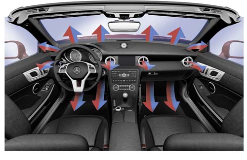 面對潮濕的雨季,車內能否乾爽與舒適,也會大大影響行車安全,尤其是雨天開車沒有冷氣吹拂前擋玻璃進行除濕的話,玻璃內部很快就會起霧,大大影響行車視線,不過或許有些人會問,雨天氣溫已偏低,如果在開冷氣的話,不就要穿外套開車?如果筆者不說,可能很多人還不知道,其實冷氣與暖氣是可以同時開啟的,這種組合可以產生乾燥的暖空氣,在相對溼度極高的環境中,可以發揮除濕與防霉的作用。何謂冷氣與暖氣同時開啟?最極端的例子便是將空調溫度旋鈕轉至最高溫處(或調至Hi),此時風箱內的熱水排閥門便會全部打開,而由鼓風機所產生的氣流在流經熱水排時,便會將熱氣帶出,此時由出風口所吹出的便是溫度相當高的暖氣。