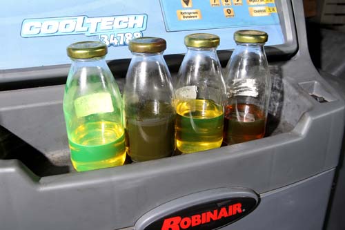 | 這四瓶是循環清洗出來的冷凍油,有些顏色都已劣化為墨綠色,其潤滑效果已大幅下降,再使用下去壓縮機的壽命一定會大幅影響,換新冷凍油後的第一印象就是壓縮機運轉變小聲,且油門變輕。 |