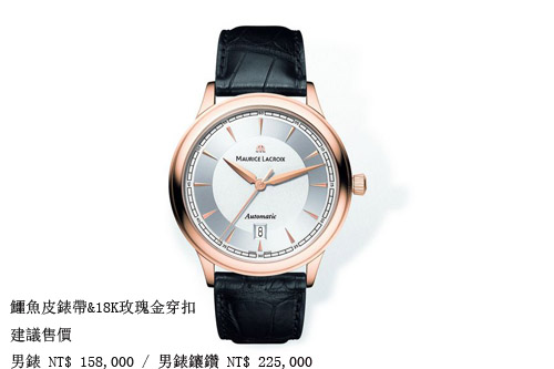 | 鱷魚皮錶帶&18K玫瑰金穿扣 建議售價 女錶 NT$ 146,000 / 女錶鑲鑽 NT$ 185,000 |